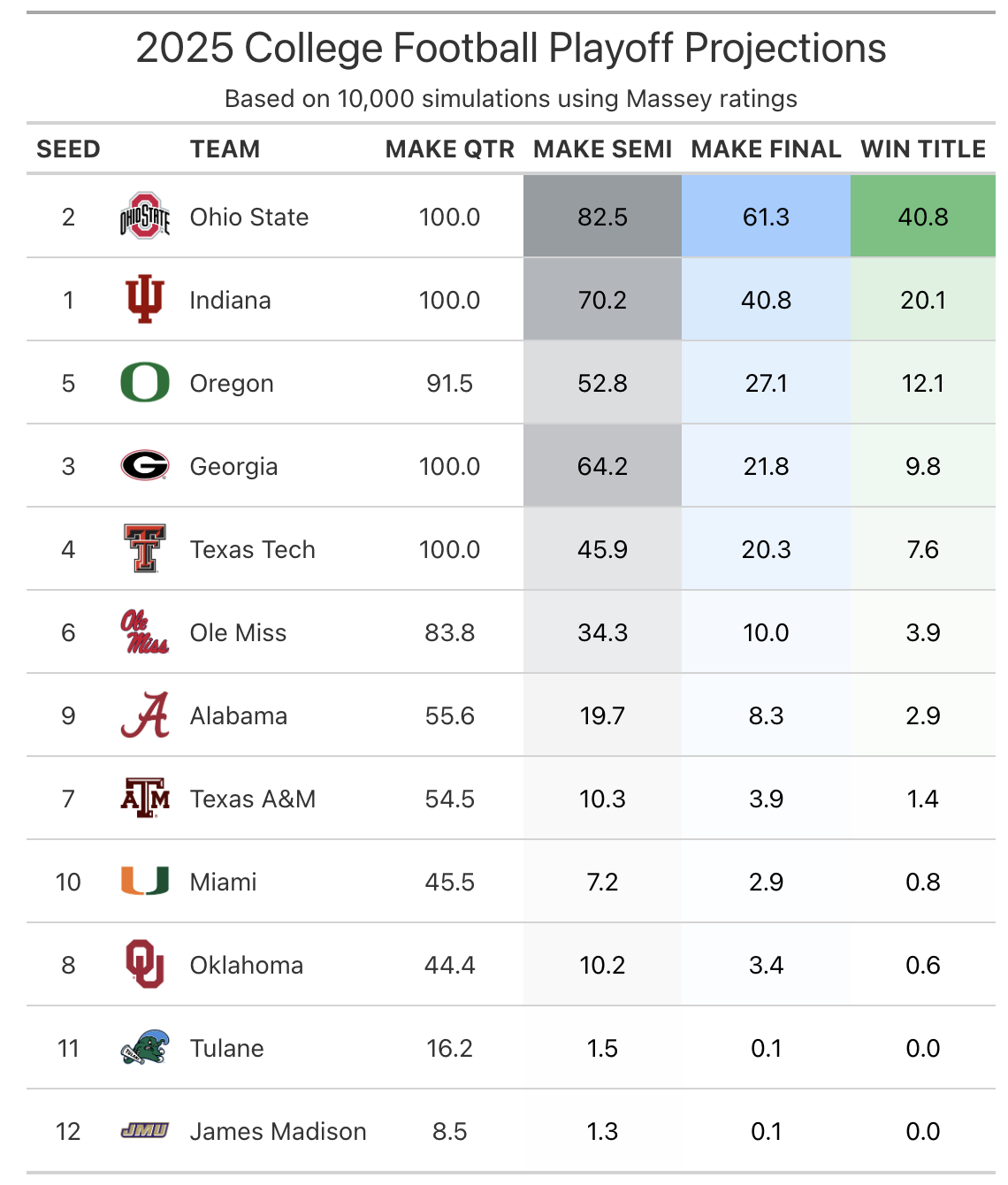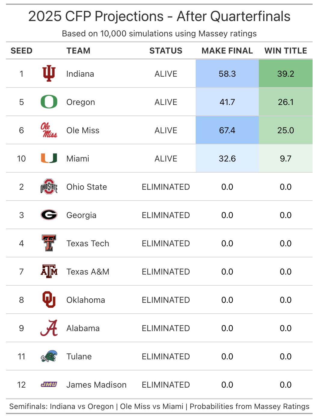 The First Round of the College Football Playoff is complete and Alabama, Miami, Ole Miss, and Oregon have all survived and advanced to the Quarterfinals. We’ve updated our simulation model after the First Round results.