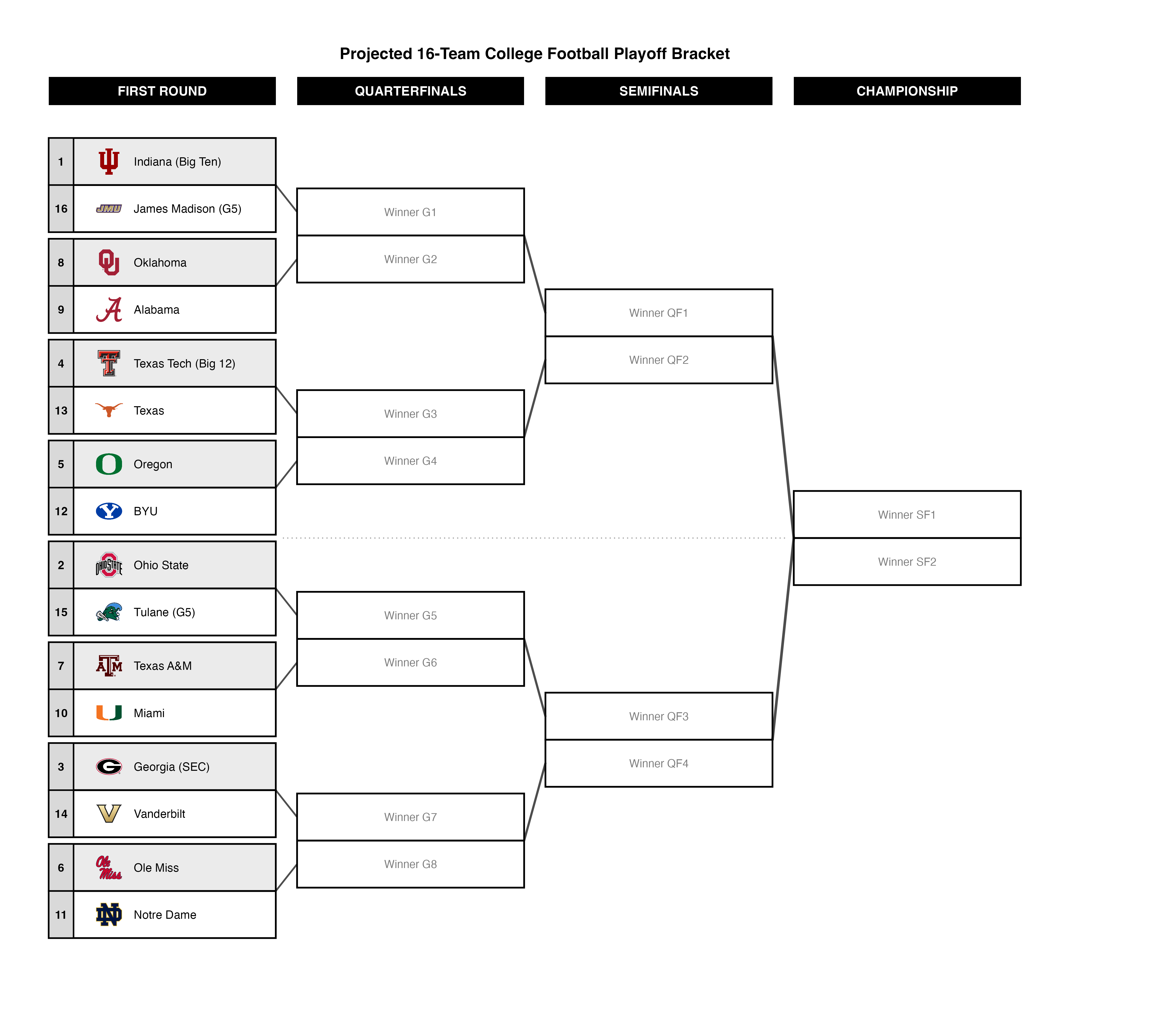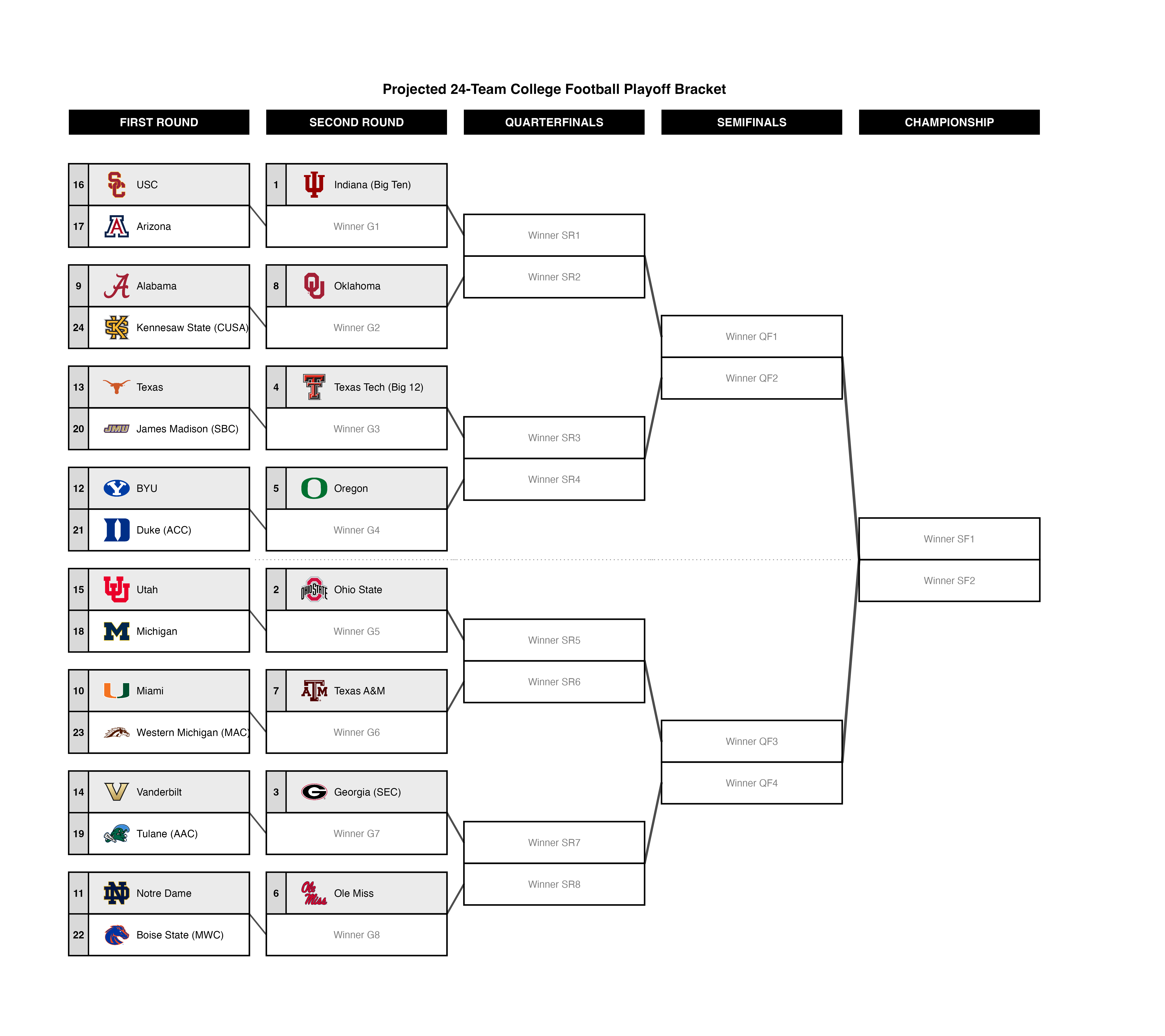 For this hypothetical bracket, we’ll assume that the automatics bids from the current CFP format (top five conference champions) remain the same. We just add four more at-large teams.